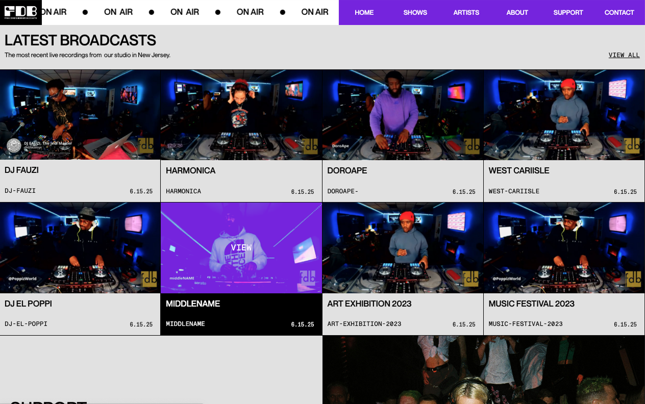 For Free Dimension Broadcasts, a music platform based in New Jersey, we developed a comprehensive visual identity, website, and social media templates that reflect their mission to connect, inspire, and uplift emerging artists. Inspired by the idea of a retro-futuristic broadcast channel that transcends time and space, we reimagined their logo in the style of vintage television networks like CBS and PBS, paired with a color palette drawn from the ambient glow of their studio. To complete the system, we introduced photo treatments referencing TV static—designed as repeatable effects the team can easily apply. With FDB still in its early stages, our focus was on creating a flexible brand foundation that can grow alongside their vision for the future.